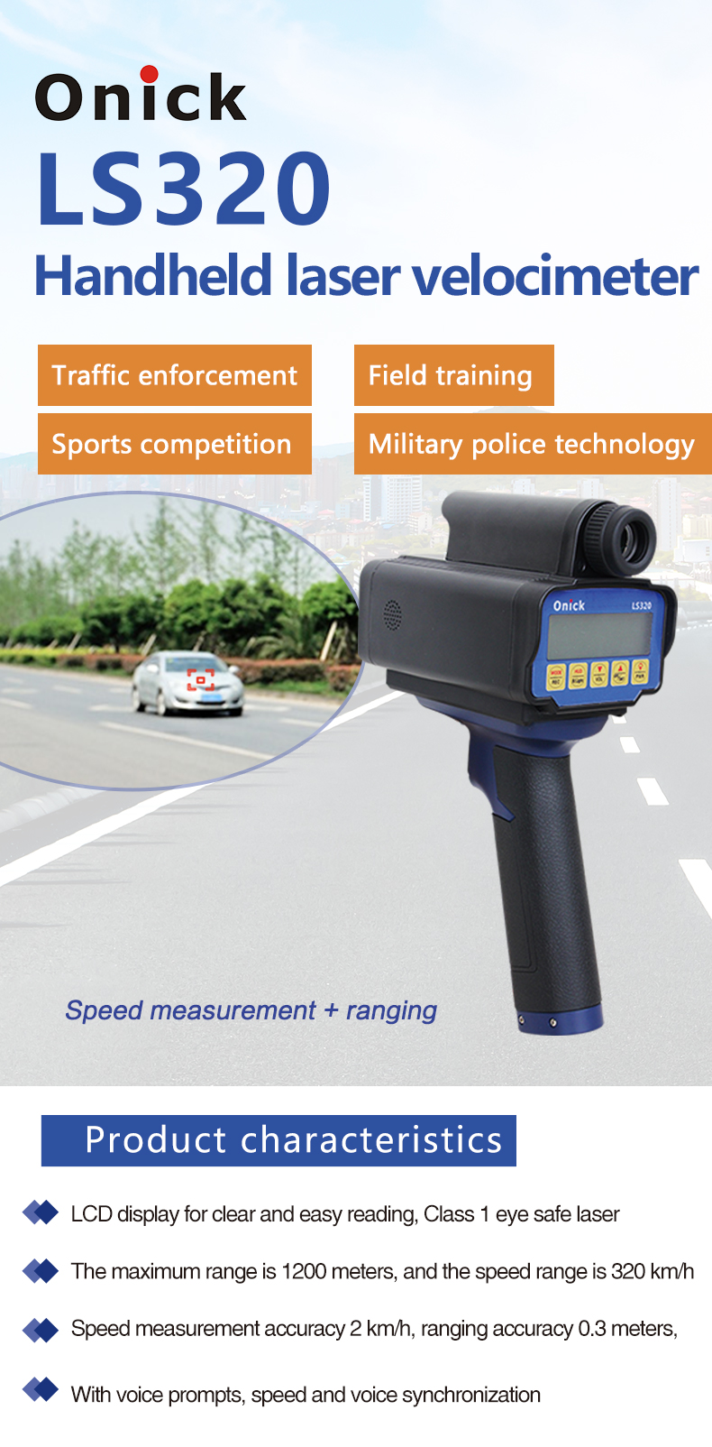 LS320 Handheld Laser Speed Meter Gun is the first laser speedometer with superior performance launched by Onick! It is welcomed by speed measurement enthusiasts for its light appearance, simple operation and rapidity. Clear LCD display, novel design, compact style, light to use, high sensitivity, clear and convenient reading! Enjoy endless speed measurement fun! Onick LS320 handheld laser speedometer is widely used in traffic law enforcement, field training, sports competition, military and police technology and other application fields.